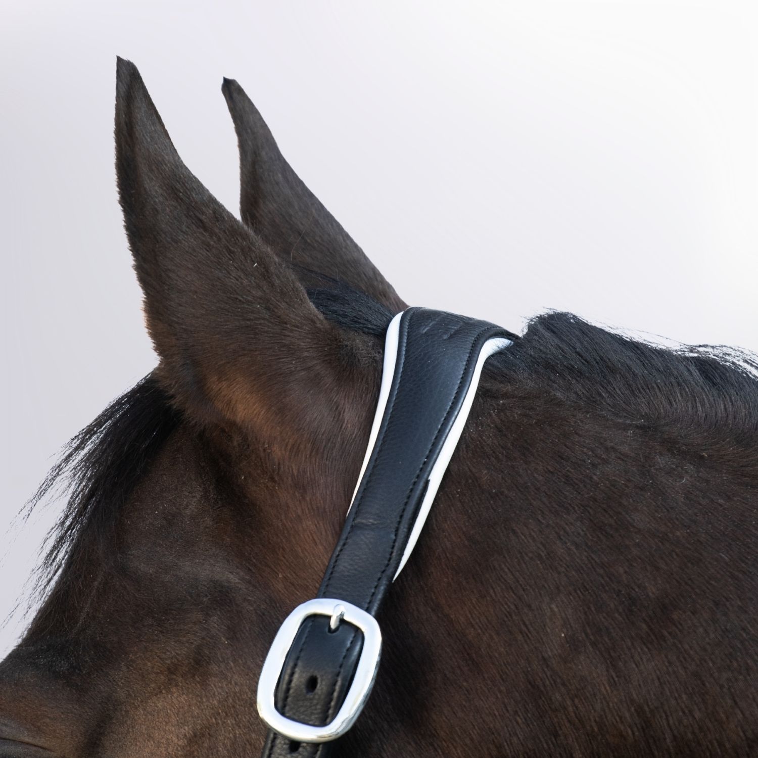 » But not only appearance but also function are unbeatable. The soft leather used here fits perfectly to your horse's head and ensures optimal comfort. The anatomical neck piece prevents uncomfortable pressure on the sensitive nerves of your horse. In addition, our halter fork is completely removable. So you can decide for yourself how the halter should be worn. You can have the metal plate engraved by an engraver near you.